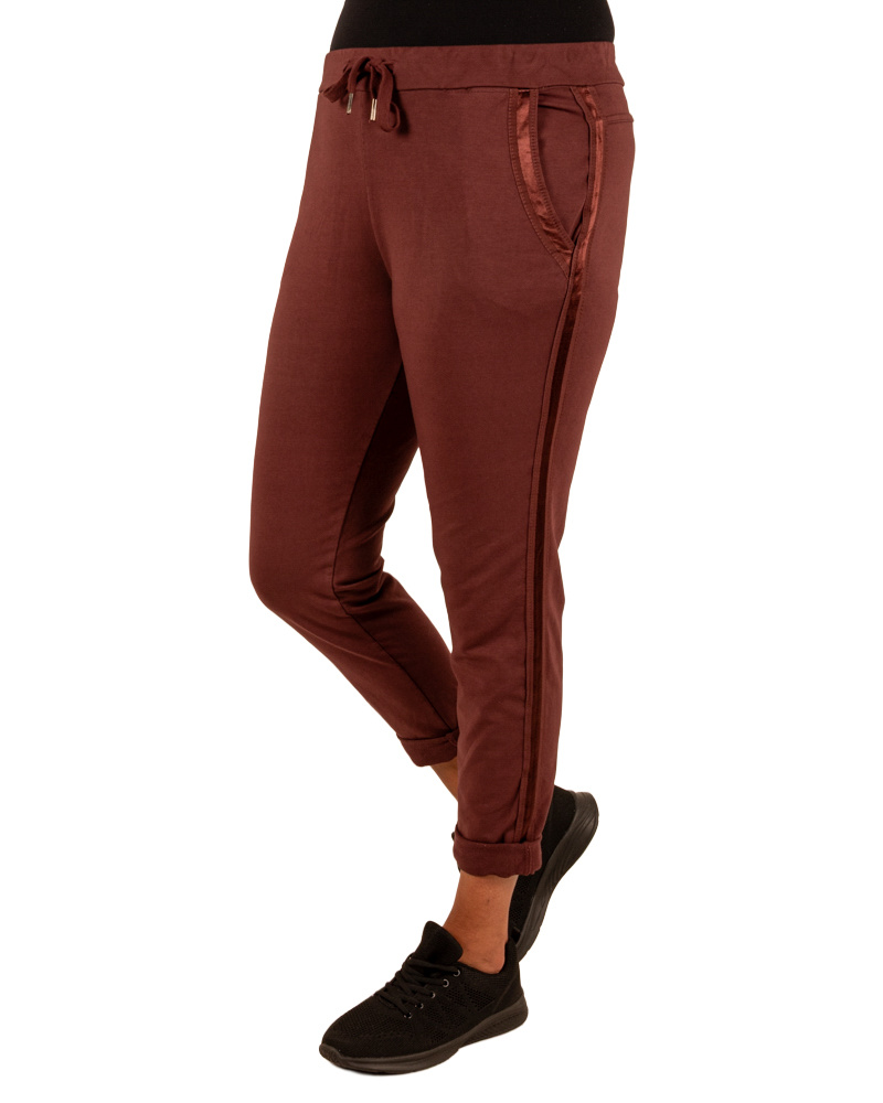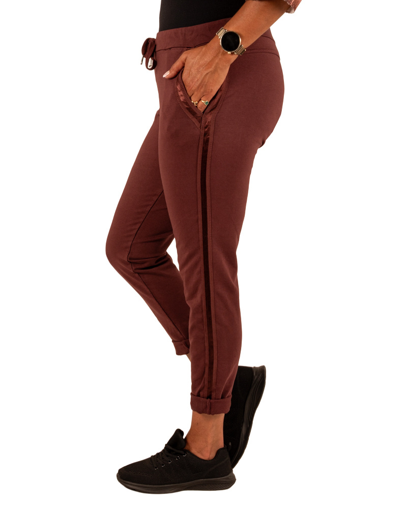 Bordeaux joggingbroek met bies van Gemma Ricceri.