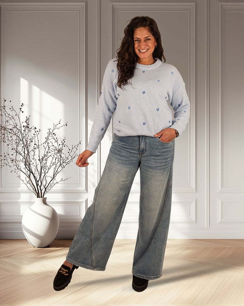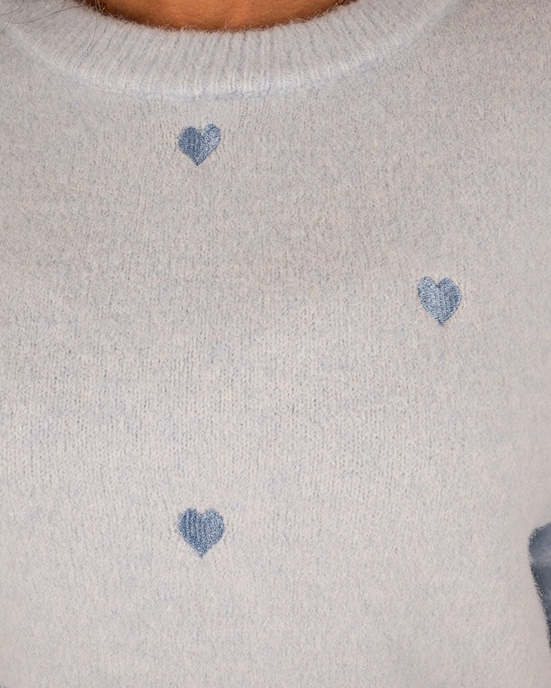 Trui met geborduurde hartjes op voorpand en mouwen.