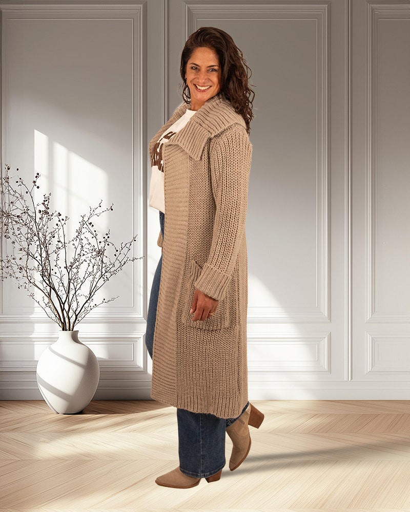 Lang vest met kraag, lange mouwen en 2 opgezette zakken.